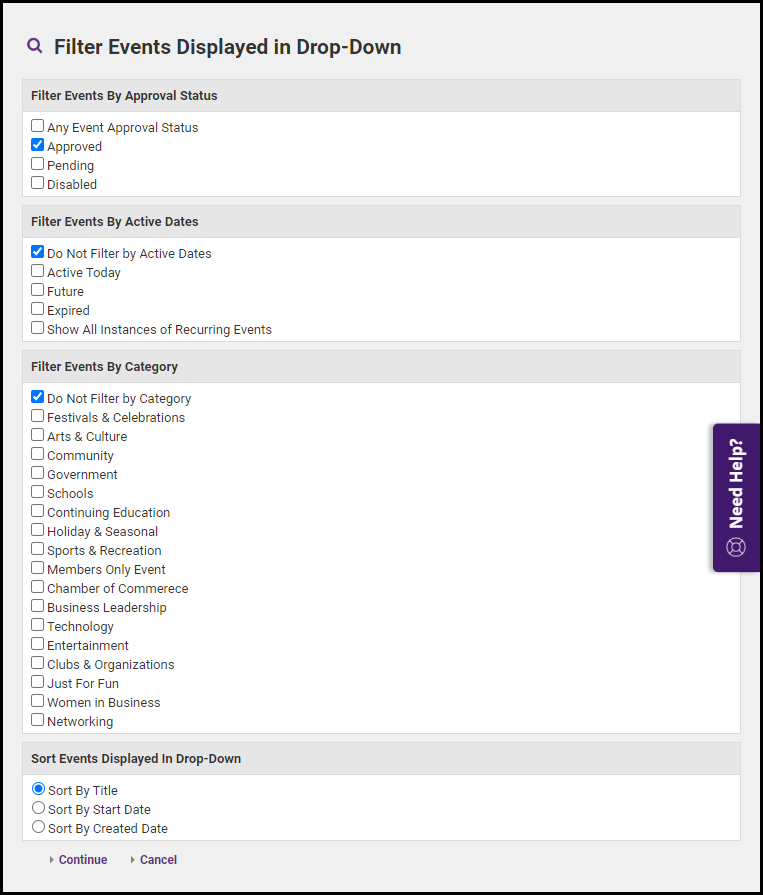 - Select the filter options link to open the Filter Events Displayed in Drop-Down window.