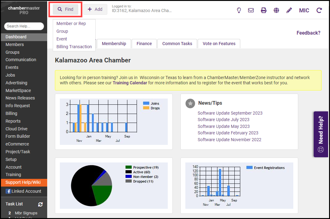 Click the Find button in the header bar, and select Event.