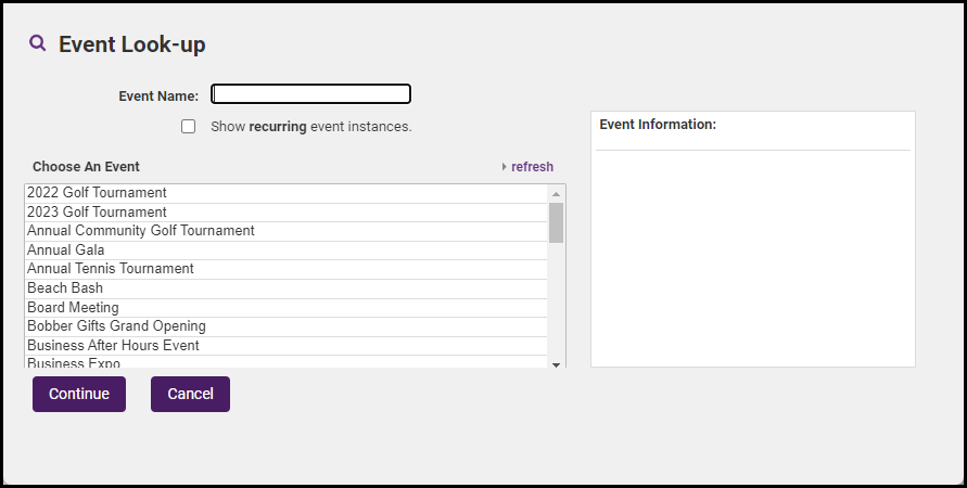 - In the Event Look-up window, search for the event by name or browse through events.