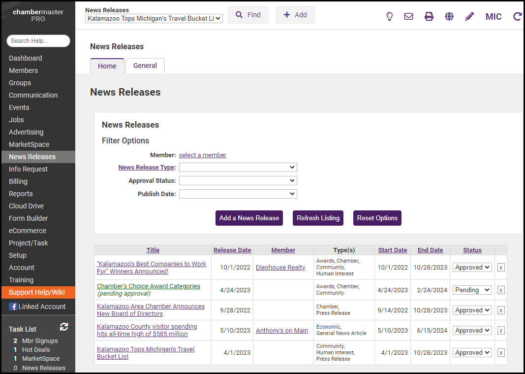 Click the title of the News Release you wish to update from the list displayed. Use the Filter Options to filter the list.
