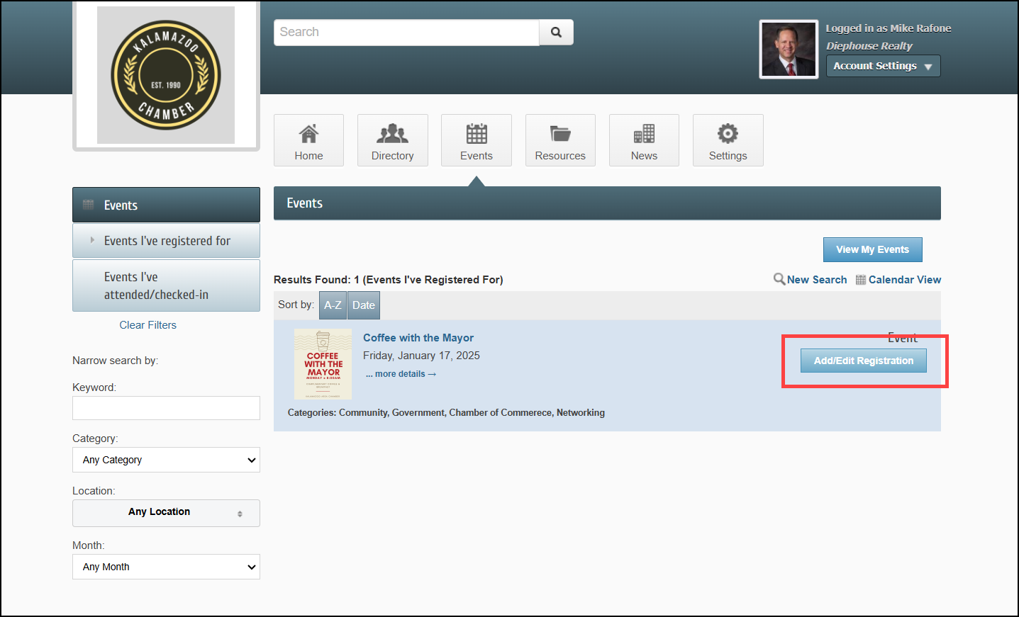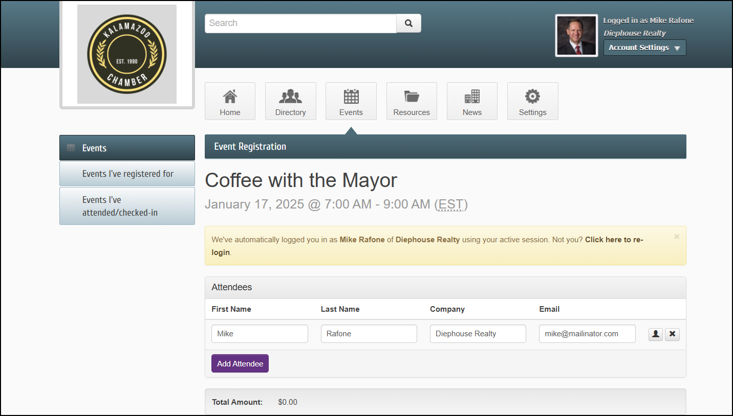 - To view event registrations, select the Events I've Registered for link.