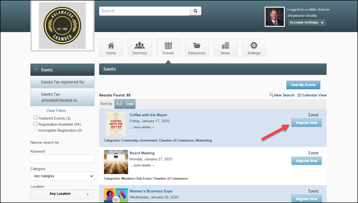- Select the Register Now button for the event you would like to register for.