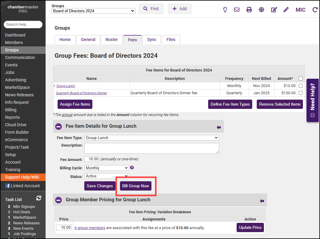 Group invoices can always be created from selections within the Groups module. If Annual, Semi-Annual, Quarterly, or Monthly was selected for the fee item Billing Cycle, then the group invoices may be created as part of a batch in the Billing module. If One-Time is chosen as the Billing Cycle on the fee item, the invoices may only be created by selecting Bill Group Now on the Fees tab in the Groups module. Group invoices are created for one group at a time. If more than one fee is assigned to the group, all fees assigned to the group will be invoiced together on one invoice.