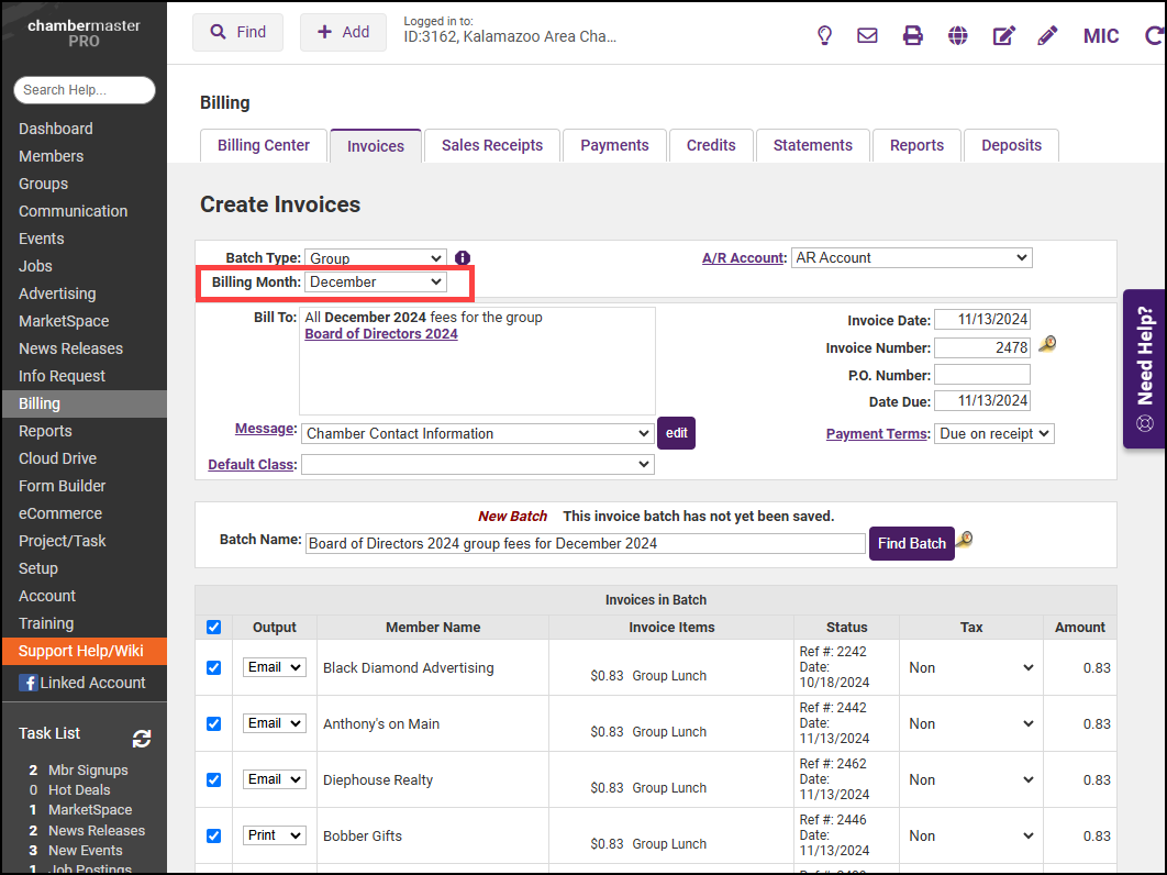 If the selected Billing Cycle is Annual, Semi-Annual, Quarterly, or Monthly, check to confirm the Billing Month dropdown selection is on the desired month. Then your group invoices will appear on the list.