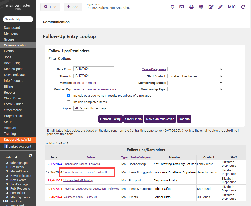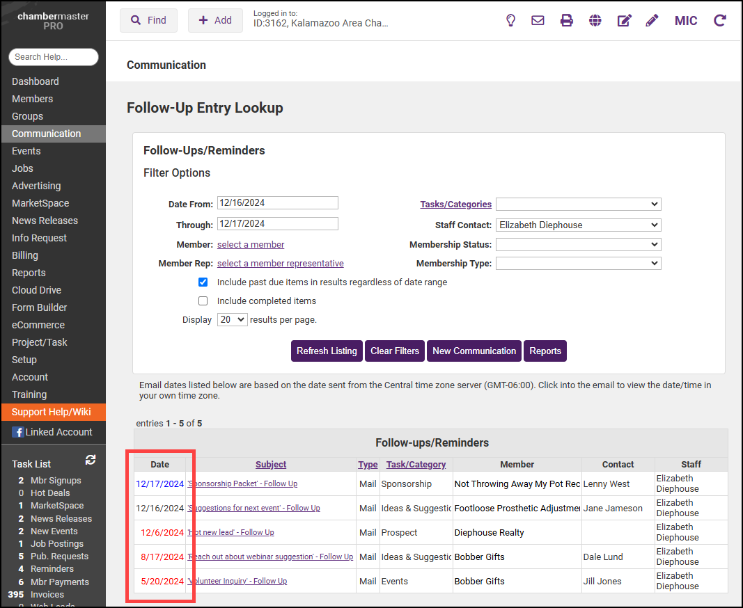 - Reminders assigned to the staff member will be displayed. Overdue reminders are listed in red, future reminders are listed in blue, and reminders due today are listed in black.