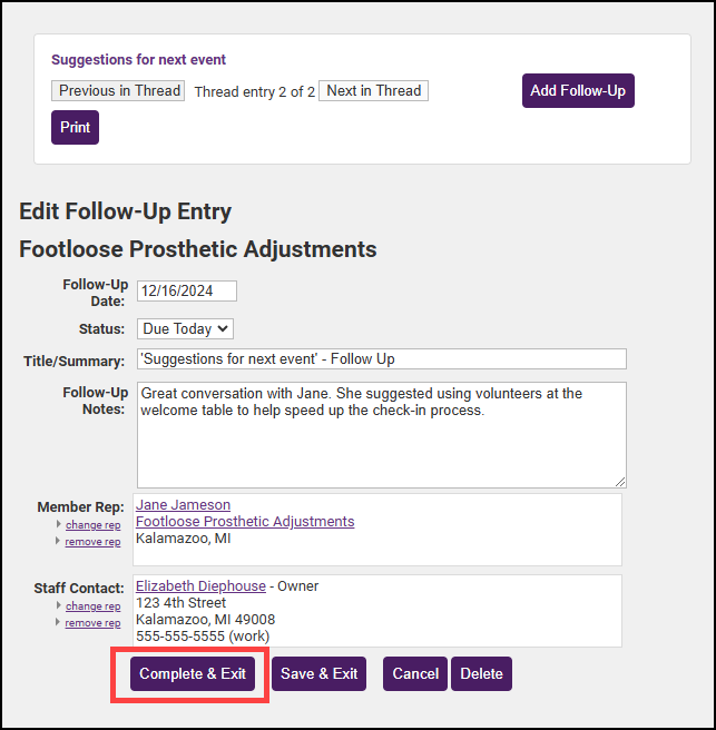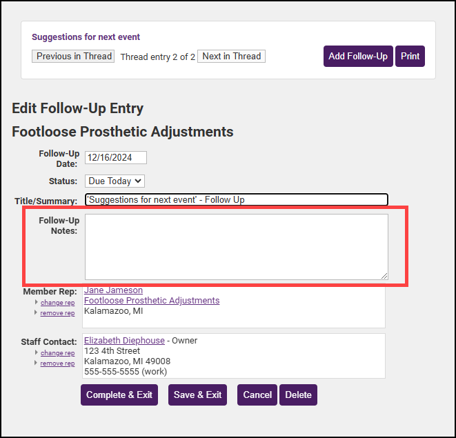 - In the Edit Follow-Up Entry window, enter any follow-up notes about the reminder.