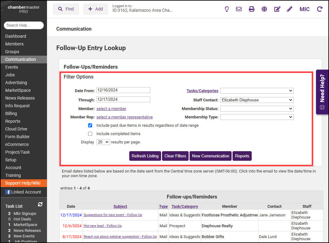 - Use the Filter Options to adjust the Date Range and view upcoming reminders.