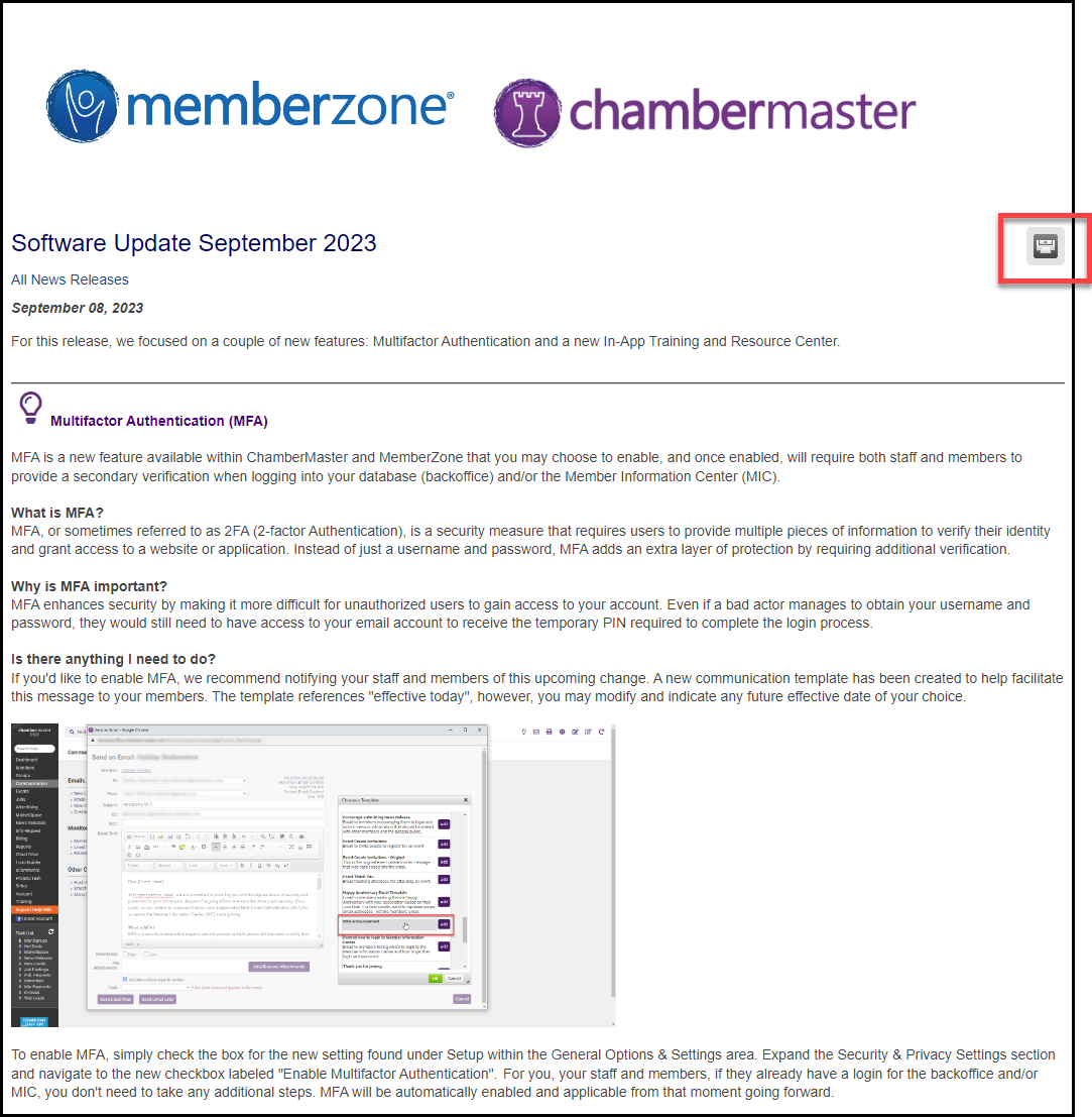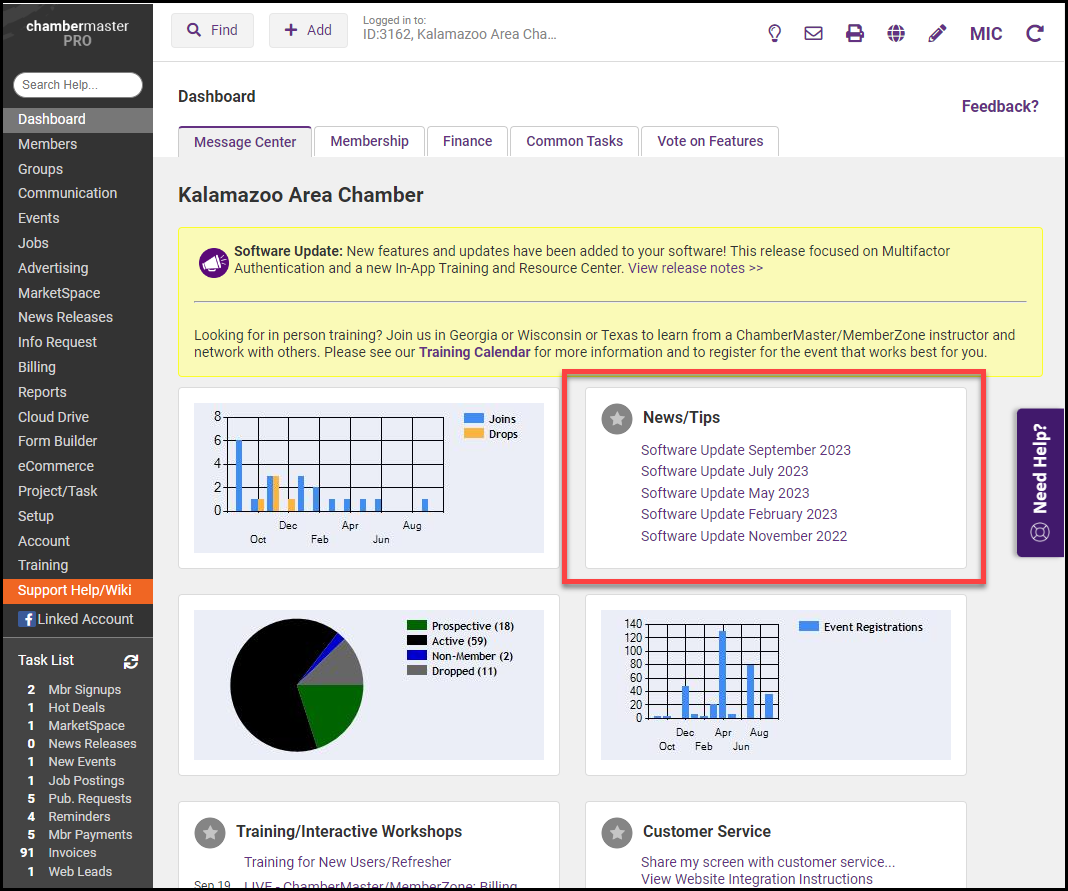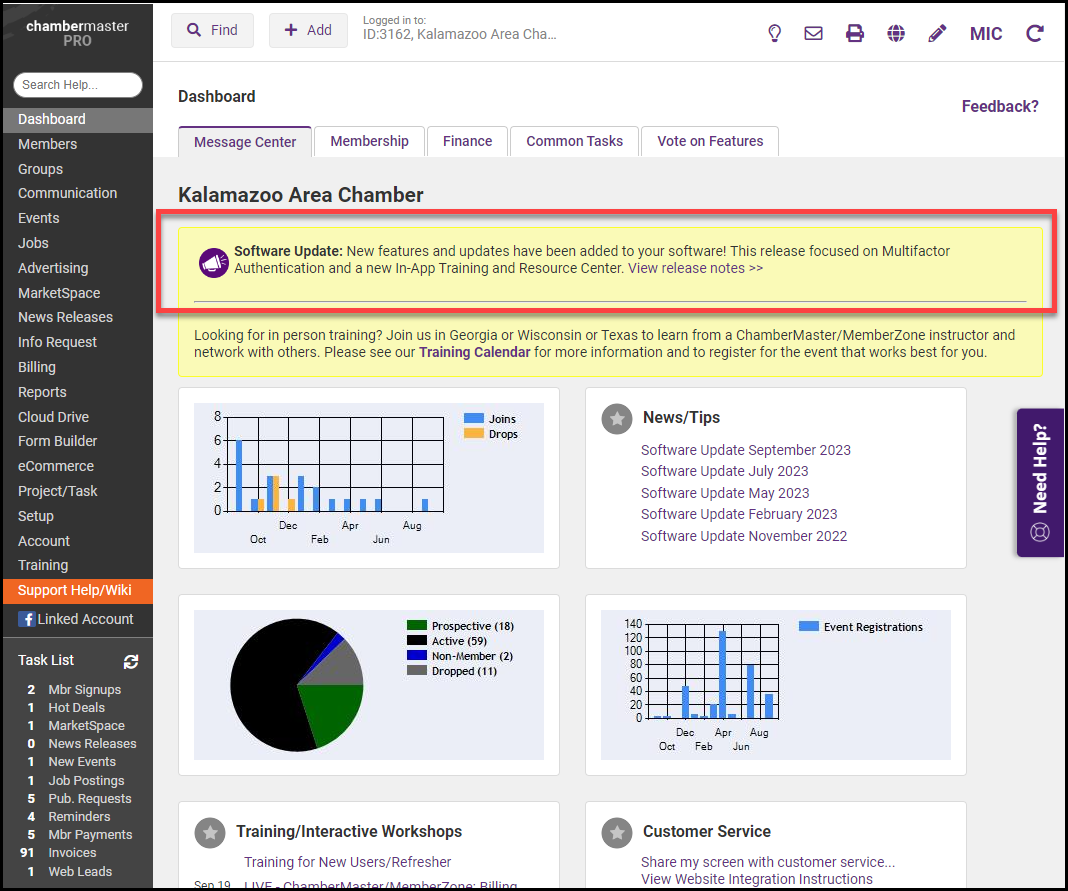 GrowthZone regularly releases new features and functionality. Notifications will be displayed on the Dashboard after you have logged into your software.