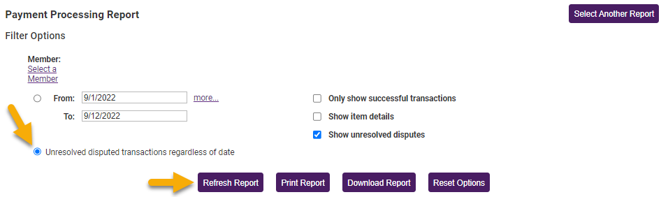 - Select the filter “Unresolved disputed transactions regardless of date”.