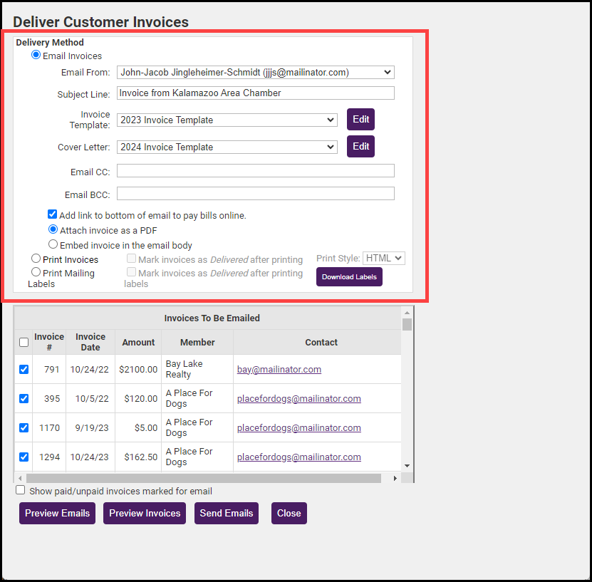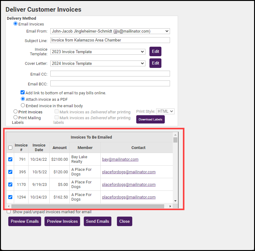 - Click the Email Invoices radio button. A summary of the invoices that will be emailed is displayed, including the Invoice #, Invoice Date, Invoice Total Amount, Member, and the contact's email address.