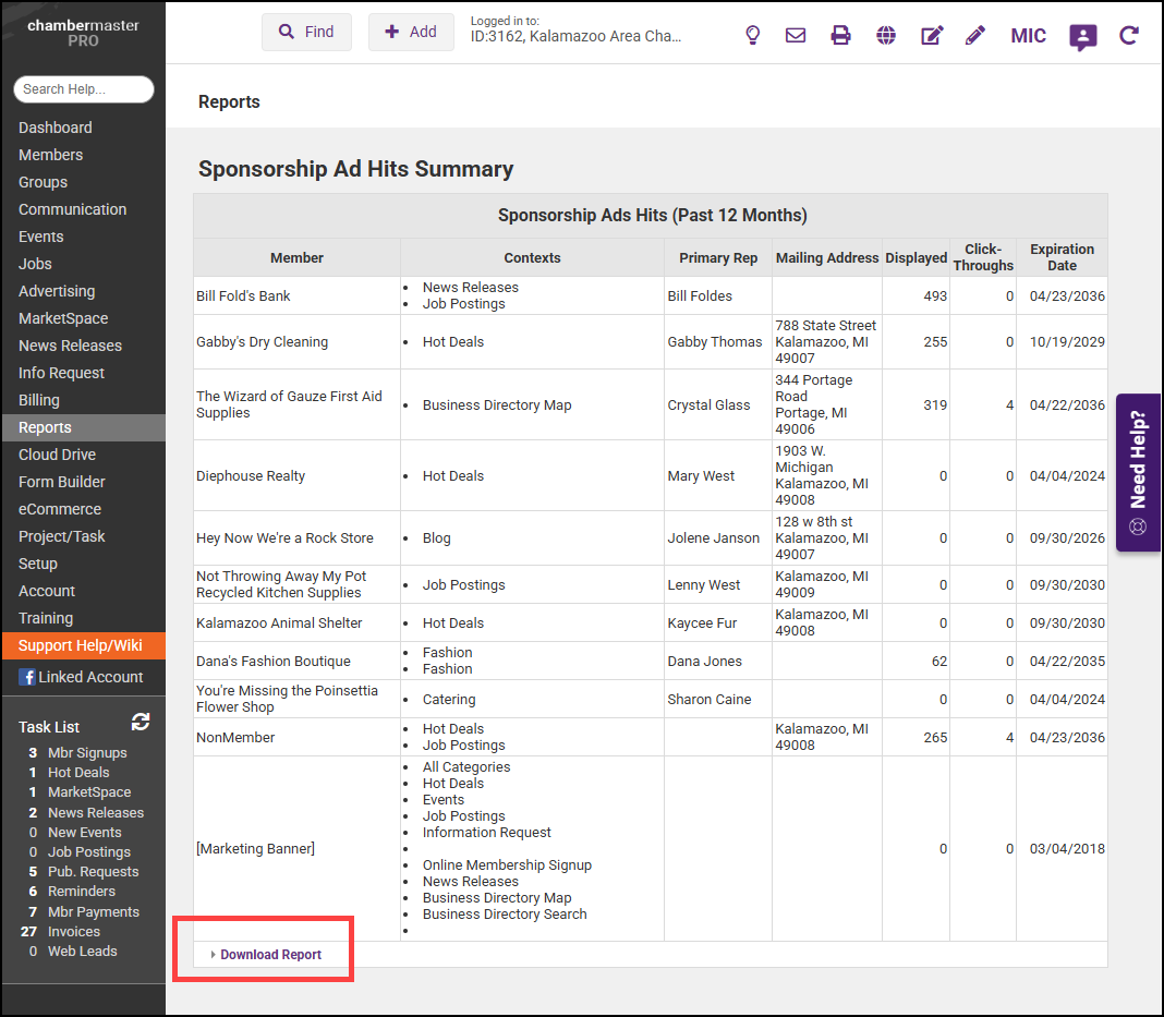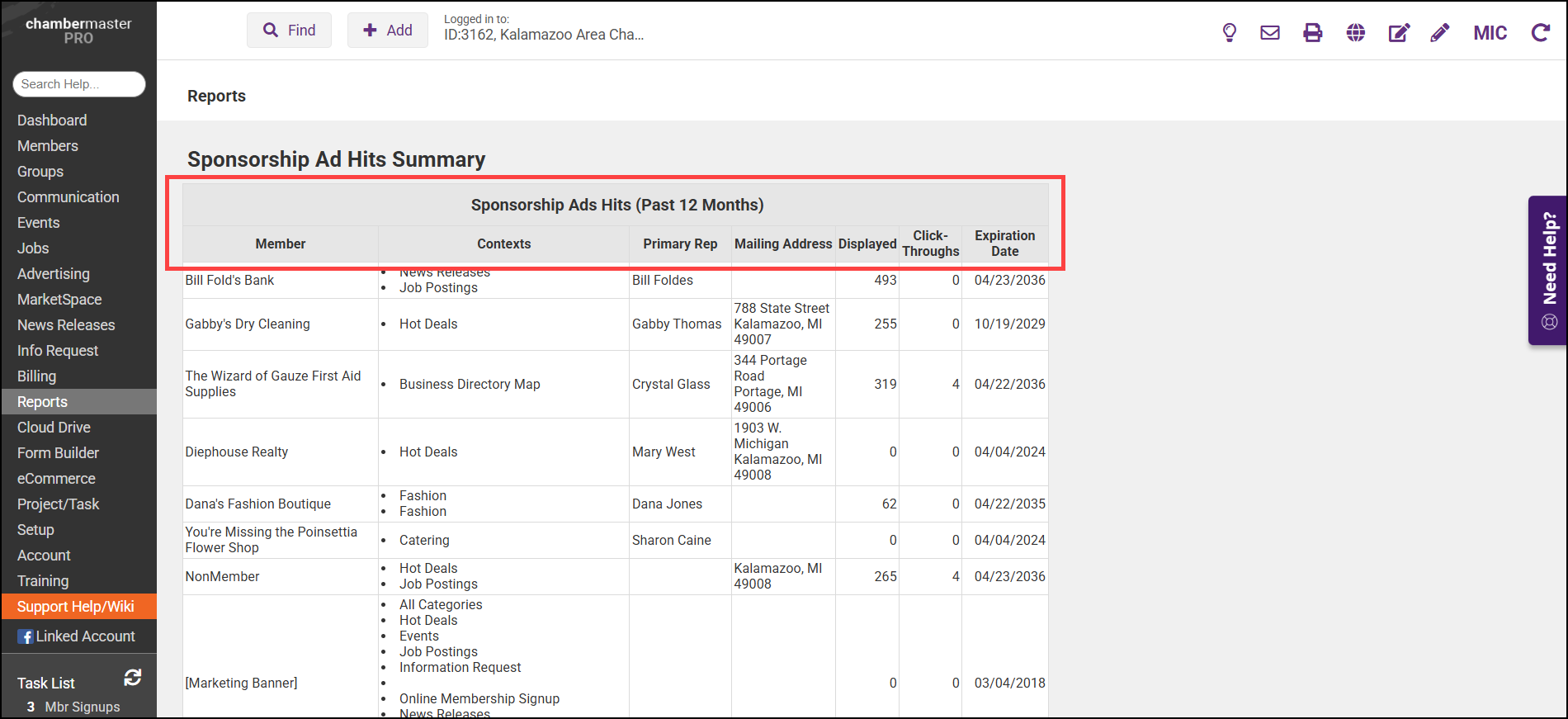 - The report will display information for the last 12 months, including where the advertisement is displayed (Contexts), how often the advertisement has been displayed in front of users (Displayed), how often the advertisement has been clicked on (Click-Throughs), and when the advertisement will expire.