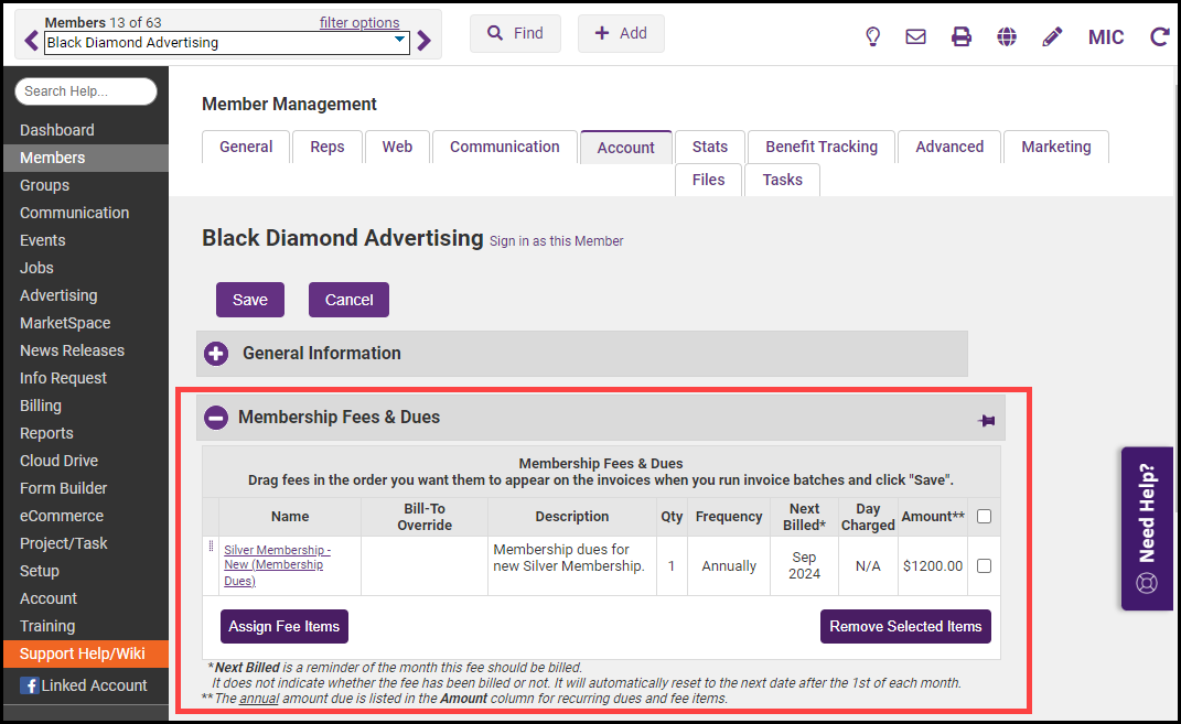 Fees/dues assigned to the member can be set as recurring regularly or added as something to invoice only one time. Once they have been assigned to their account, they can be invoiced under Billing->Invoices (Integrated Billing).