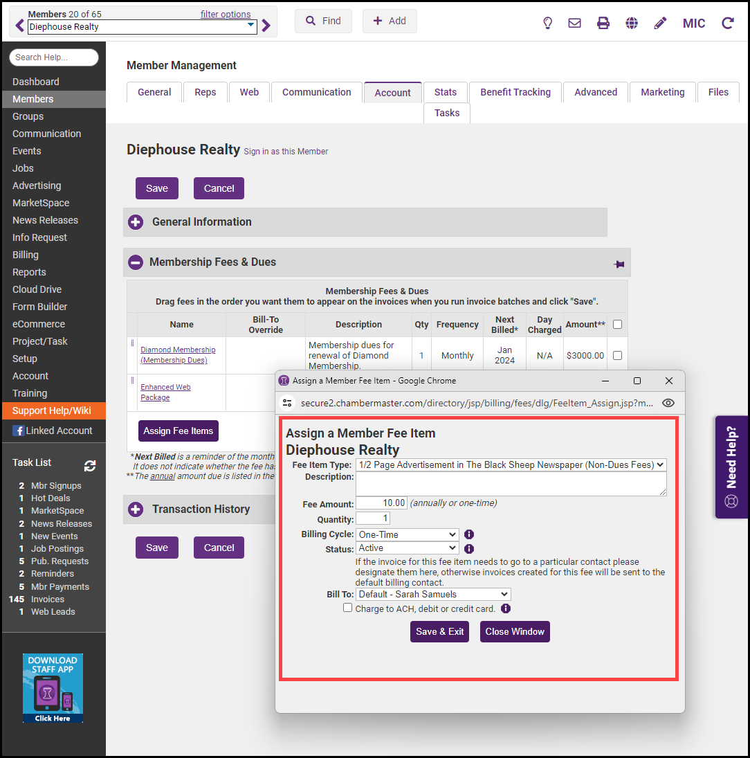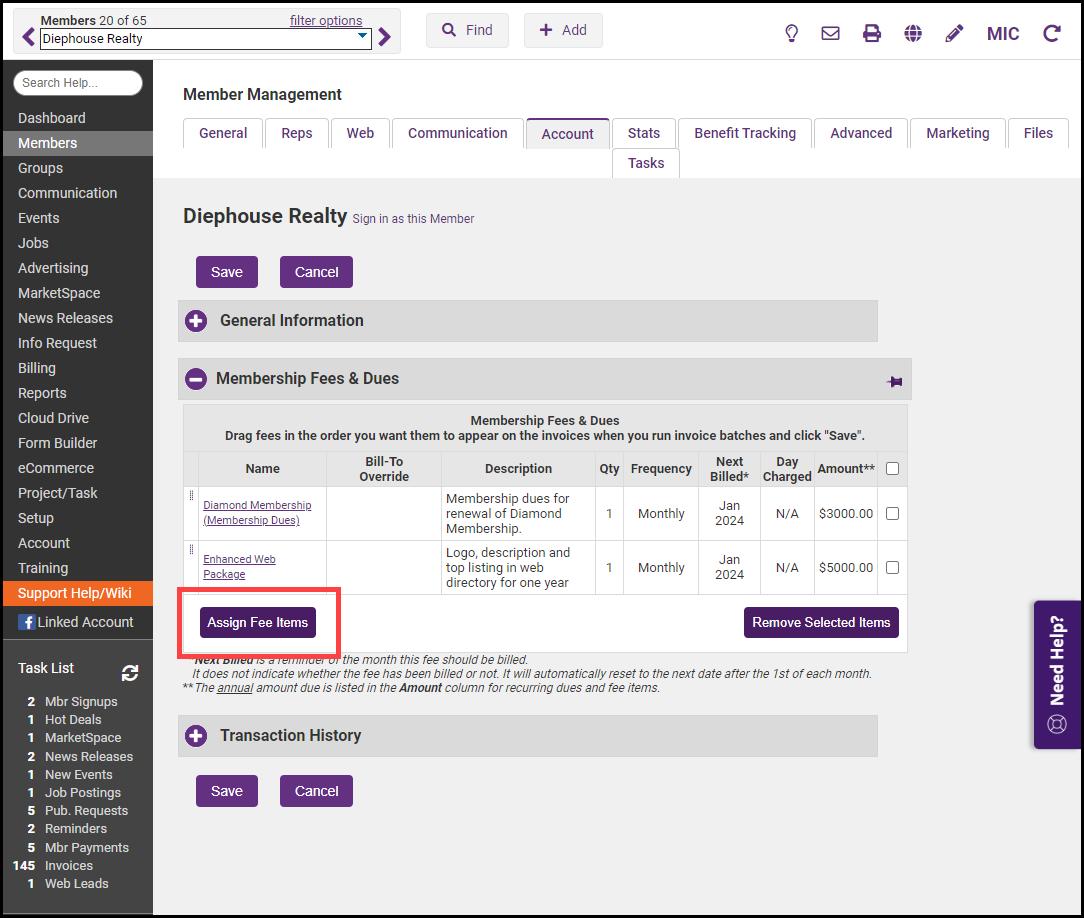 - On the member's Account tab, click Assign Fee Items in the Membership Dues and Fees area.