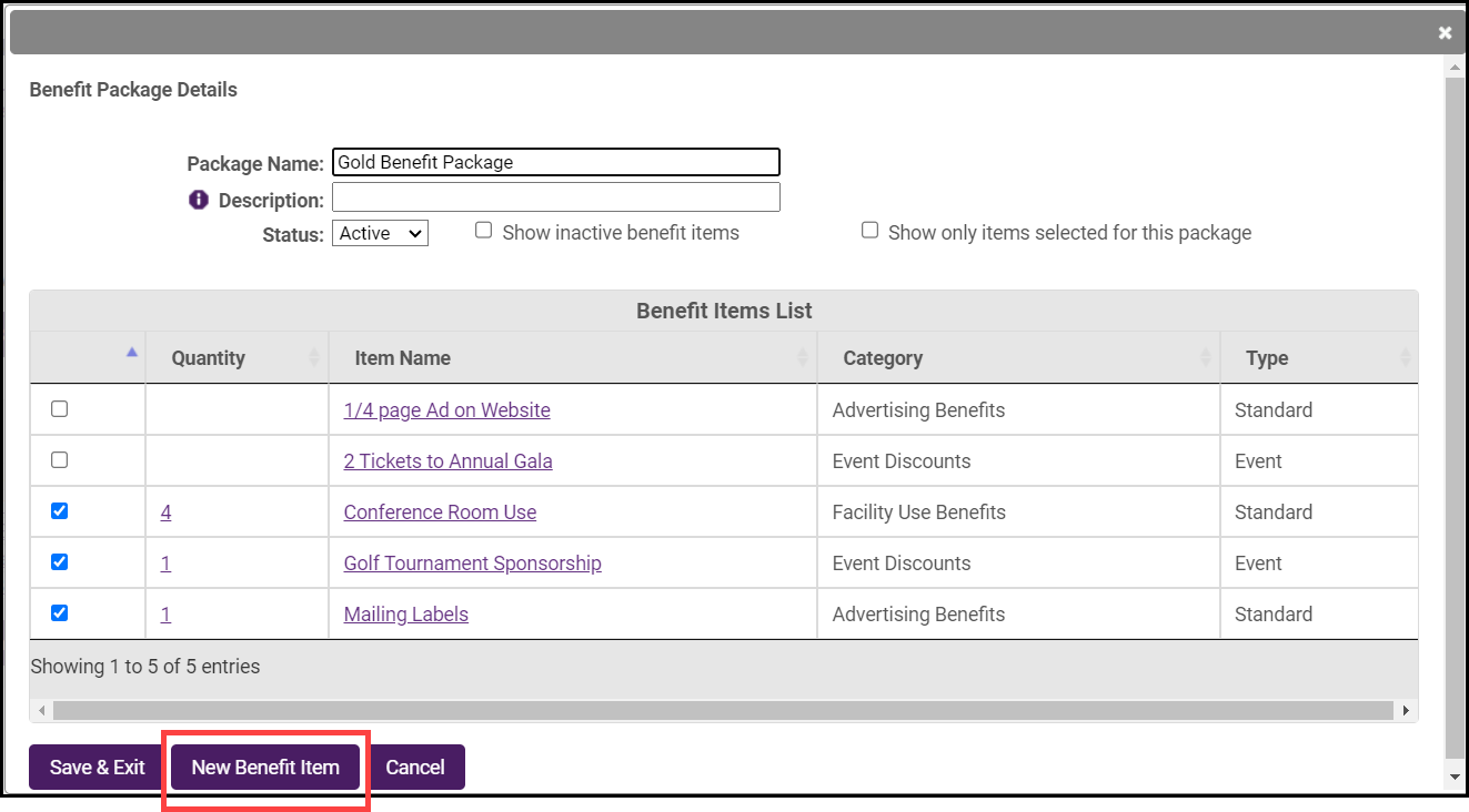 When you create Benefit Packages, any active Benefit Items will be available to add to the package. When a Benefit Item has been created, it is available for selection in all of your benefit packages, not just the one within which you created it.