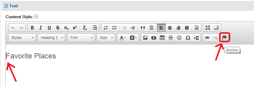 Within a text area of a SmartCMS site, place your cursor before the content that should become the top of the screen when that section is accessed, then click on the flag icon in the toolbar across the top of the text editor.