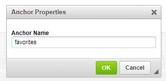 Click OK to create the anchor point, then save the text area. When creating a link to this section from a button, text link, etc. elsewhere on the page, create your hyperlink, and in the destination/URL field enter a # symbol followed by the name you created for your anchor.