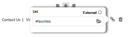 When creating the hyperlink, use the URL or relative link of the destination page, such as /about-us, then add the # symbol followed by the name you created for your anchor. For example, if adding a link on my home page to take the visitor to the “Favorite Places” section of my About Us page, on the home page I would enter /about-us#favorites into the destination/URL field.