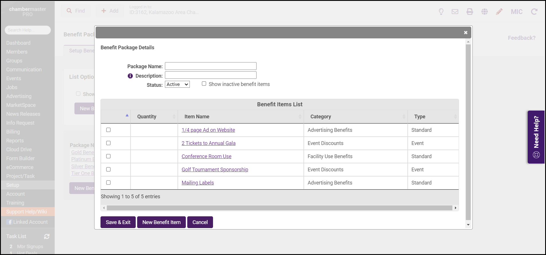 Select the Benefit Items you wish to include in this package. A list of all active benefit items you currently have created in your system will be displayed. If needed, click the New Benefit Item button to add a new item. See Add New Benefit Items for instructions.