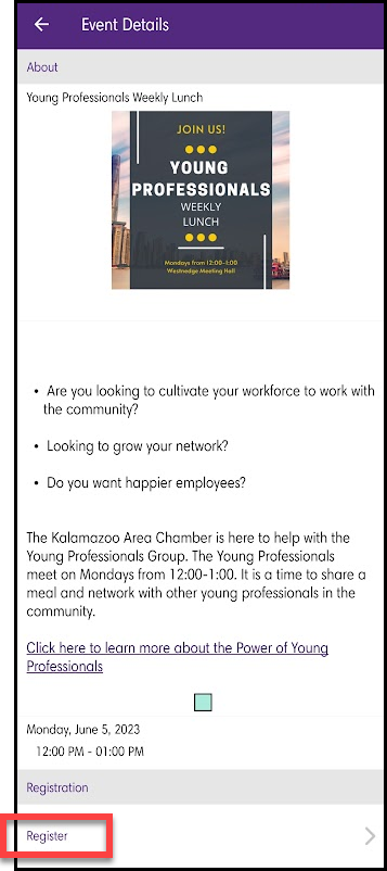 - Click Register. By clicking Register, the device's browser will be opened to display the event registration page. Complete the registration page, as you would if accessed online via your website or the MIC.