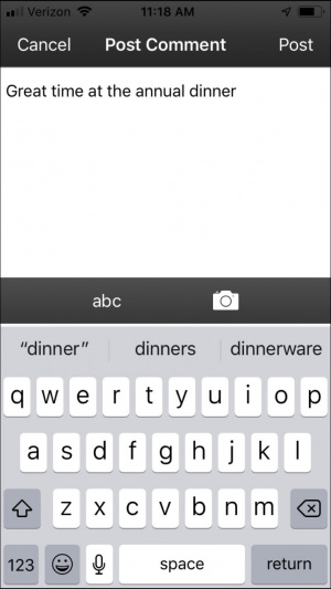 - Enter your text, and/or click the camera icon to take a picture (or choose a picture from your device) to add to the post.
