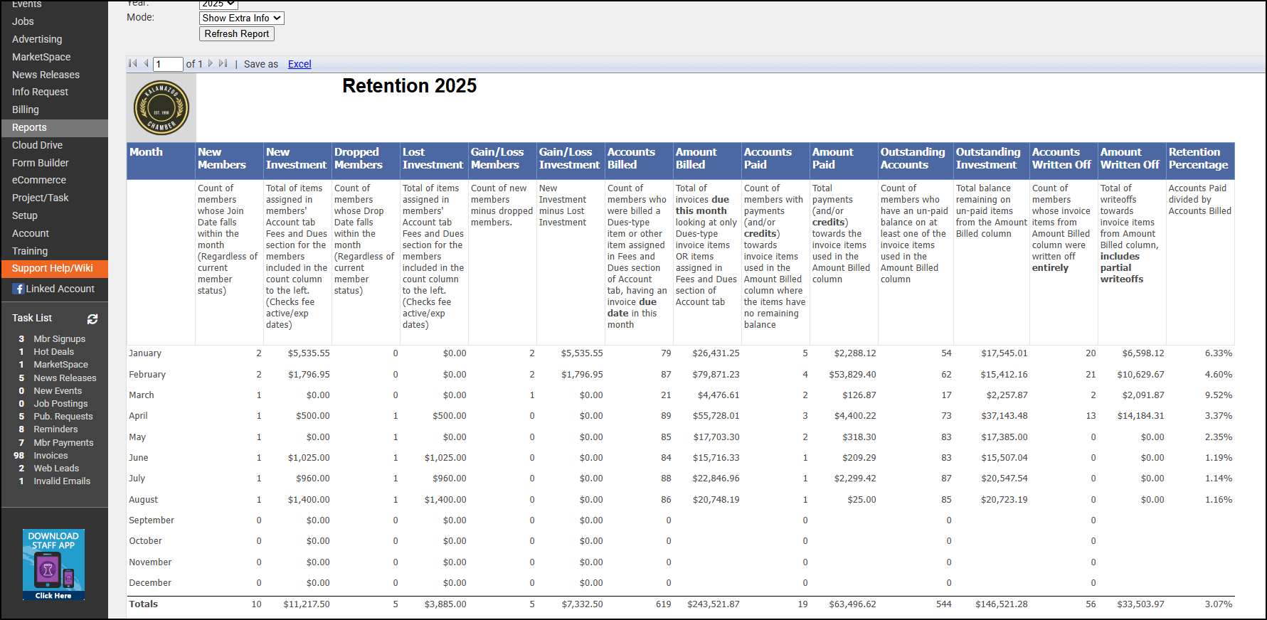 - Select Refresh Report. The report will display a full overview of the year, including New/Dropped Members each month, Investments Gained/Lost, and Retention Percentage.